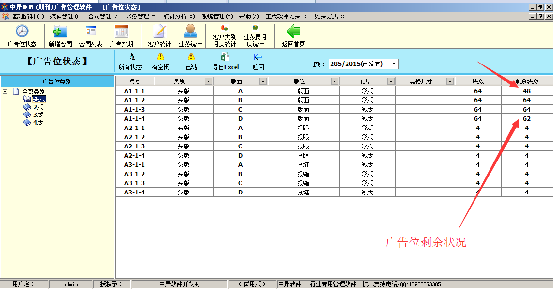 3、廣告排期:查詢客戶每期廣告位刊登,方便排版,已撤等信息,顏色提醒廣告位到期